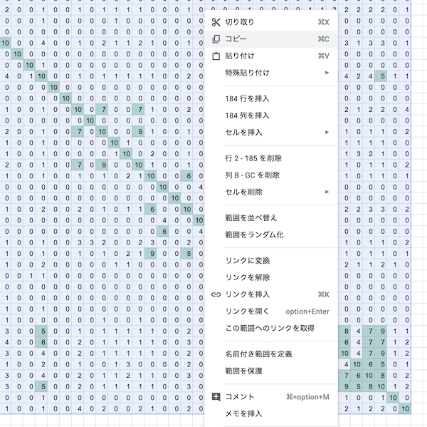 B2セル以降に比較表が作成されたら、B2セルから表の右下までを選択してコピーします。