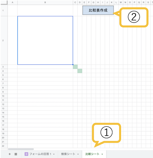 検索結果取得が終了したら、比較シートに移動して、「比較表作成」ボタンを押します。