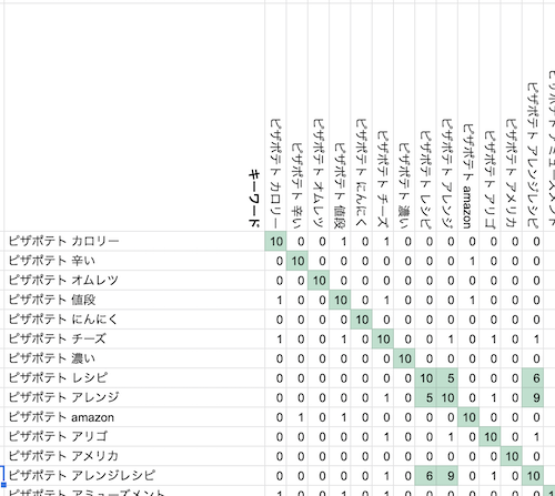 (比較表の左上から右下に向かってスコア10が並んでいるのは、同じサジェスト同士の比較だから、というわけです。)
