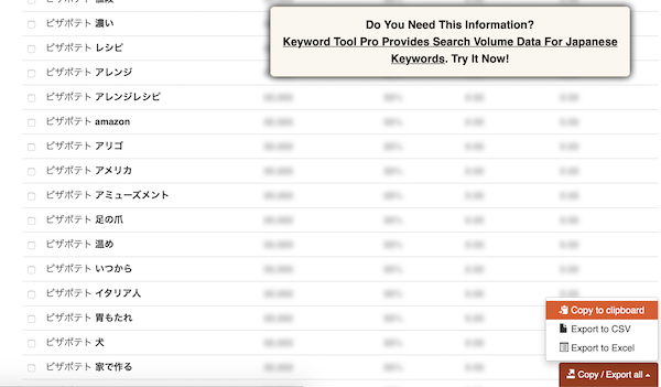 キーワード一覧が表示されたら、右下から「Copy/Export all」→「Copy to clipboard」を選択します。