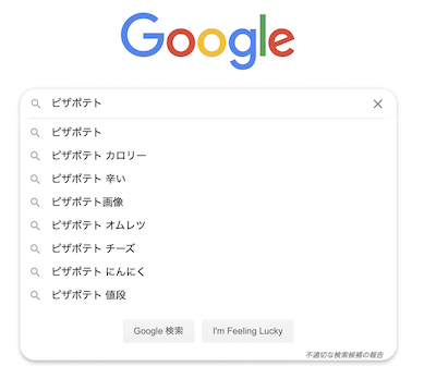 この例だと、「ピザポテト」と入力すると「ピザポテト カロリー」といったキーワードが提案されますが、 言い換えれば「ピザポテト カロリー」というキーワードでも検索されていますよ、 カロリーについて知りたいですか?とグーグルが提案しているわけです。