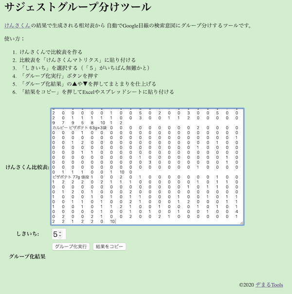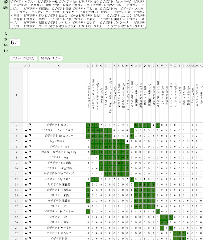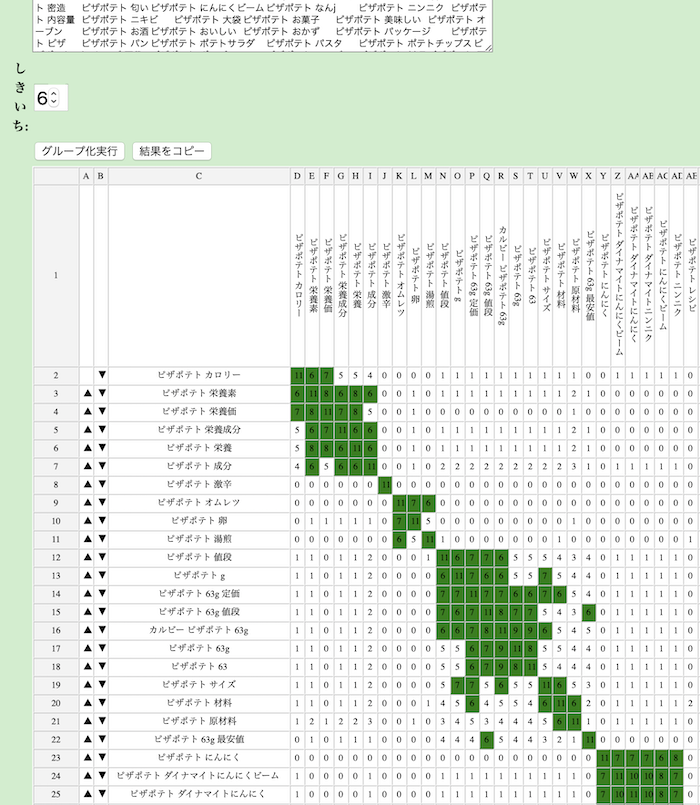 「しきいち」はデフォルトの「5」のままにしておき、「グループ化実行」ボタンを押します。